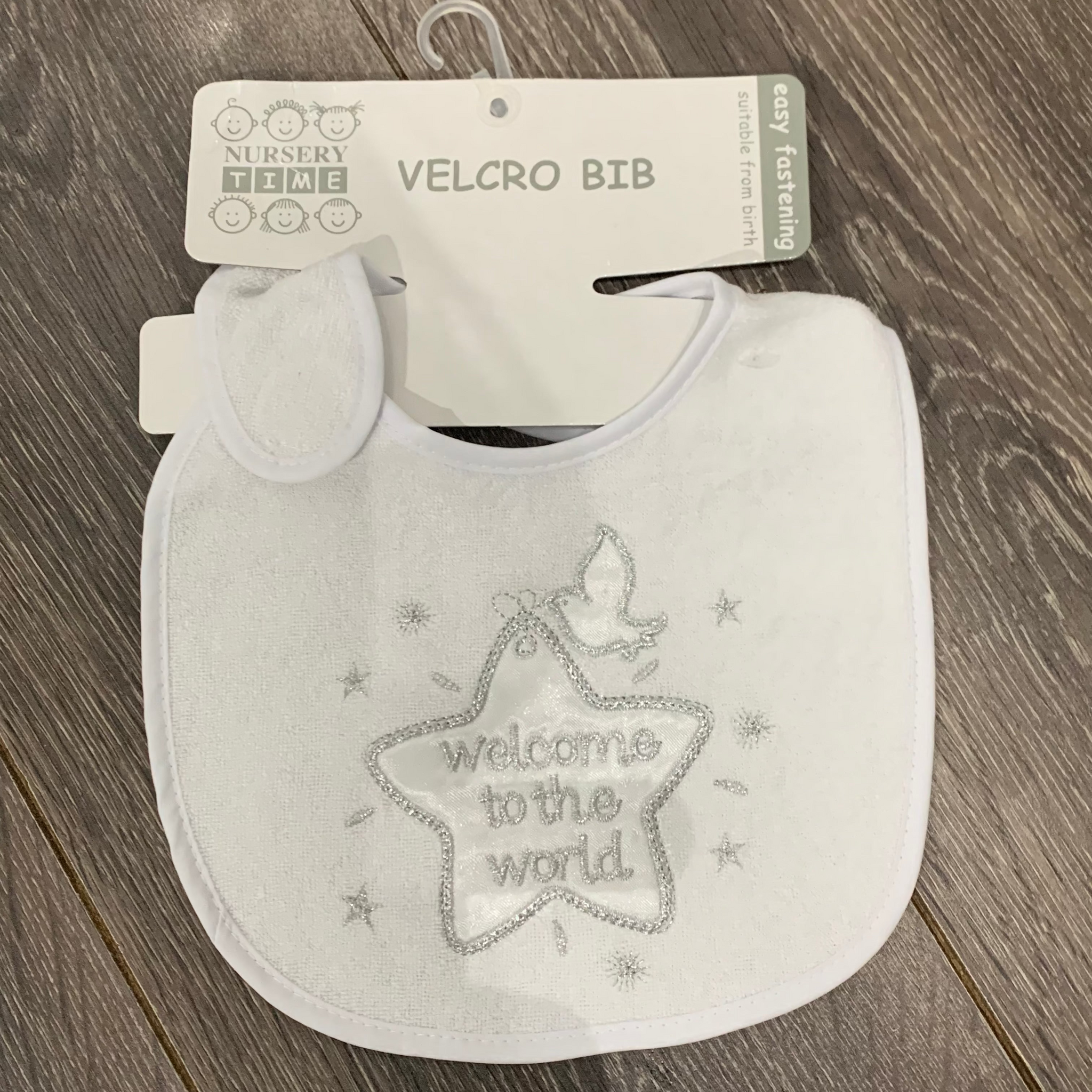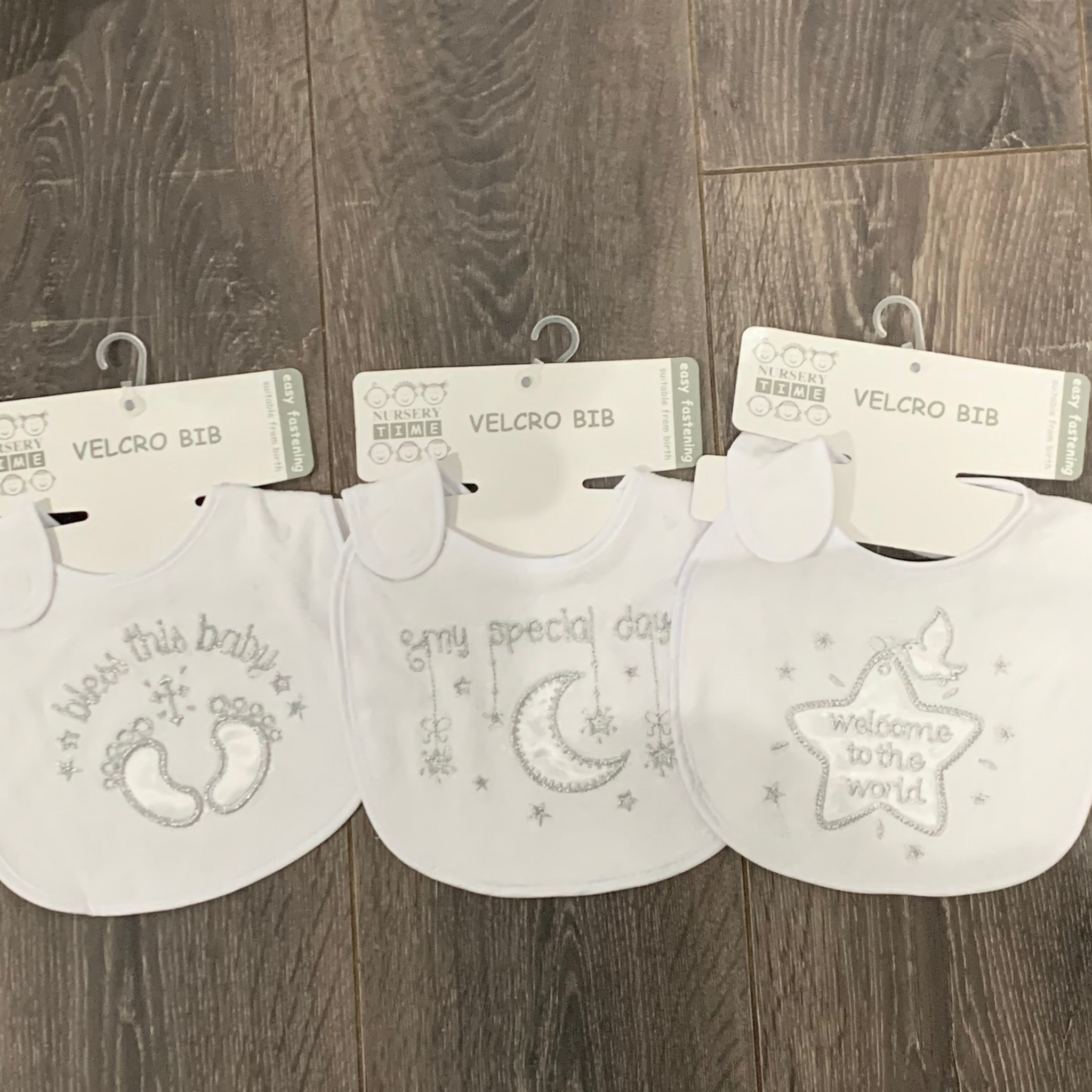 Pretty white baby christening bib with silver embroidery